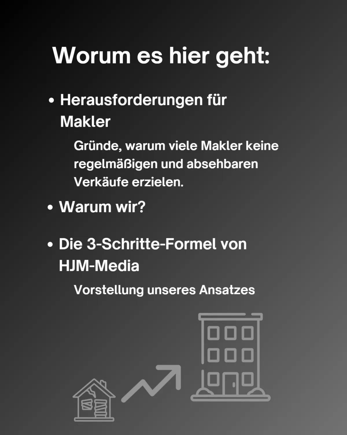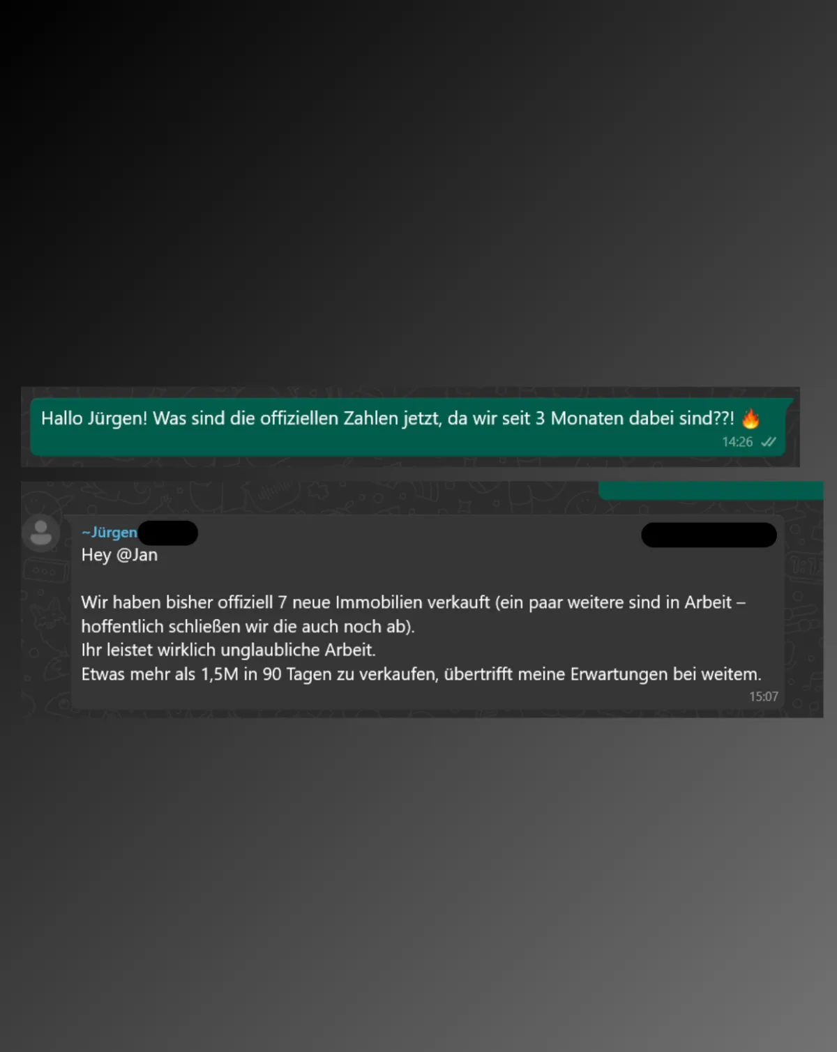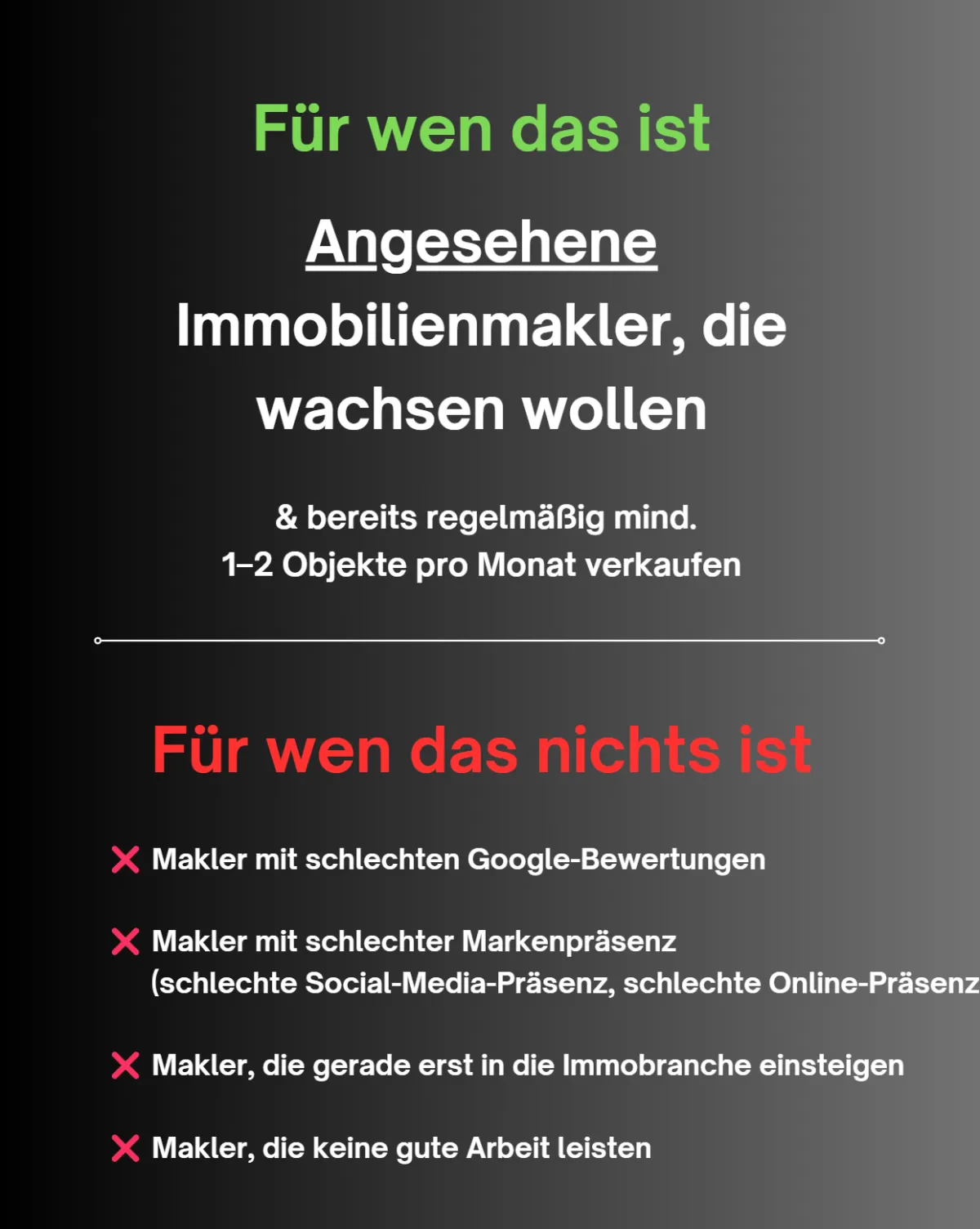 Hinweis zur Zusammenarbeit: Wir arbeiten mit Maklern, die ernsthaft wachsen wollen. Unsere Leistung basiert überwiegend auf Erfolgsbasis – ein fairer Grundbetrag deckt den Start ab, der Rest hängt von deinem tatsächlichen Erfolg ab. Ergebnisse garantiert. Schriftlich.